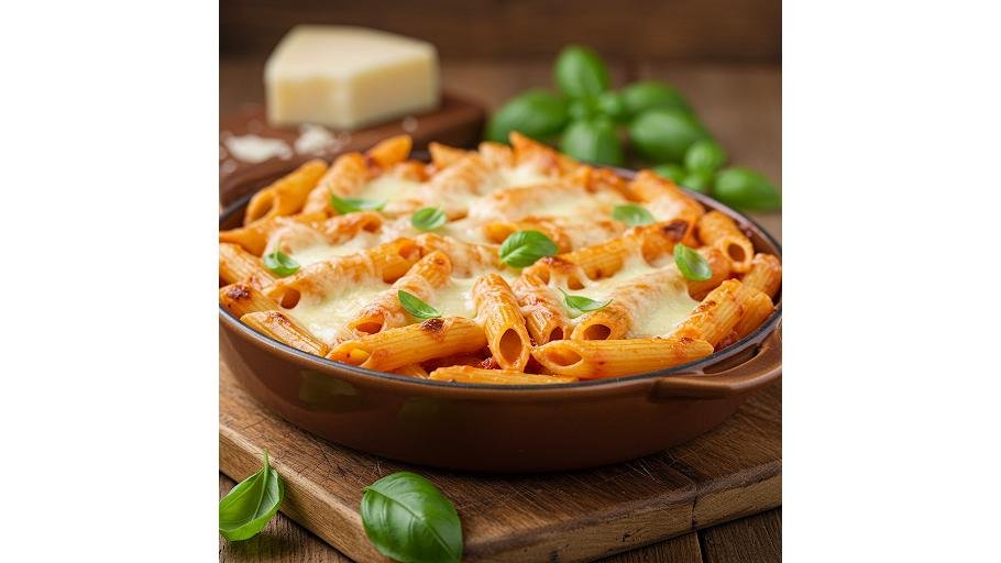 penne, sos rosii, piept pui, patrunjel, busuioc, usturoi, mozzarella 600g Poza cu titlu informativ