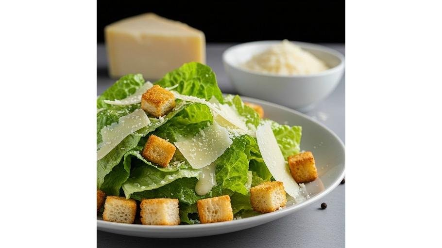 salata verde iceberg, piept de pui, crutoane, rosii, parmezan, dressing caesar`s, lamaie, foccacia 550g Poza cu titlu informativ