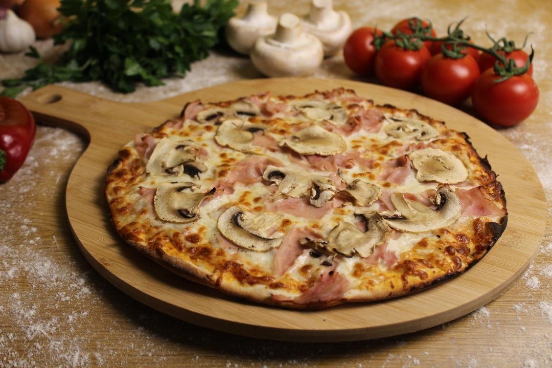 45cm Blat, sos rosii, mozzarella, sunca, ciuperci