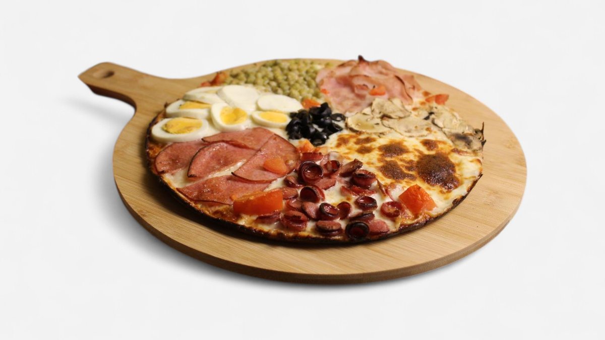 30cm Blat, sos rosii, mozzarella, salam, sunca, carnati, ciuperci, ou fiert, mazare, masline, rosii proaspete, cascaval