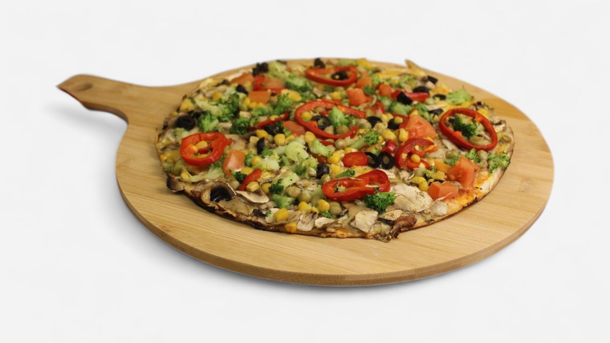 30cm Blat, sos rosii, mozzarella, ciuperci, cascaval, ardei gras, porumb, mazare, masline, rosii proaspete
