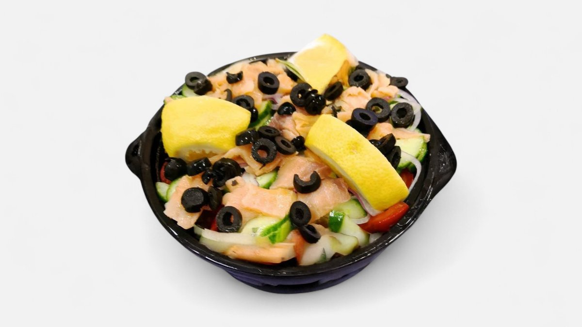 mix salata rosii, castraveti, ceapa, masline feliate, porumb, somon fume, dressing caesar`s, foccacia 600g
