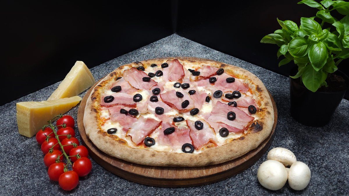 blat, sos de rosii, pecorino, fior di latte, prosciutto cotto, bacon, ciuperci, masline - 585g