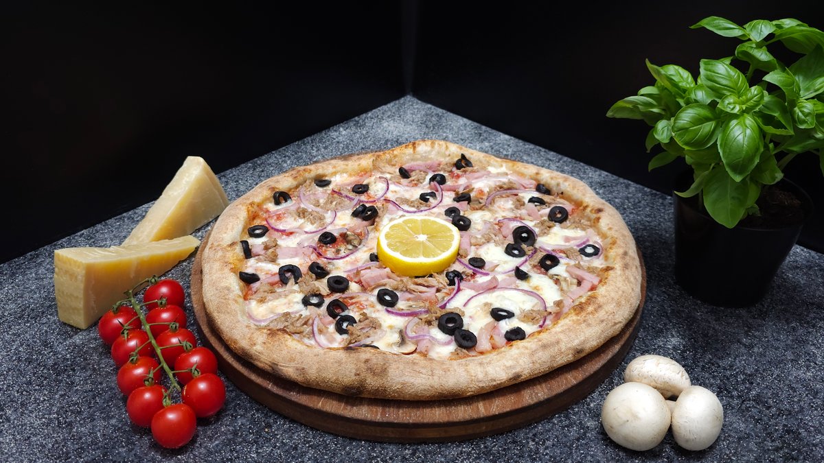 blat, sos de rosii, pecorino, fior di latte, ton bucati, ciuperci, ceapa rosie, lamaie - 600g
