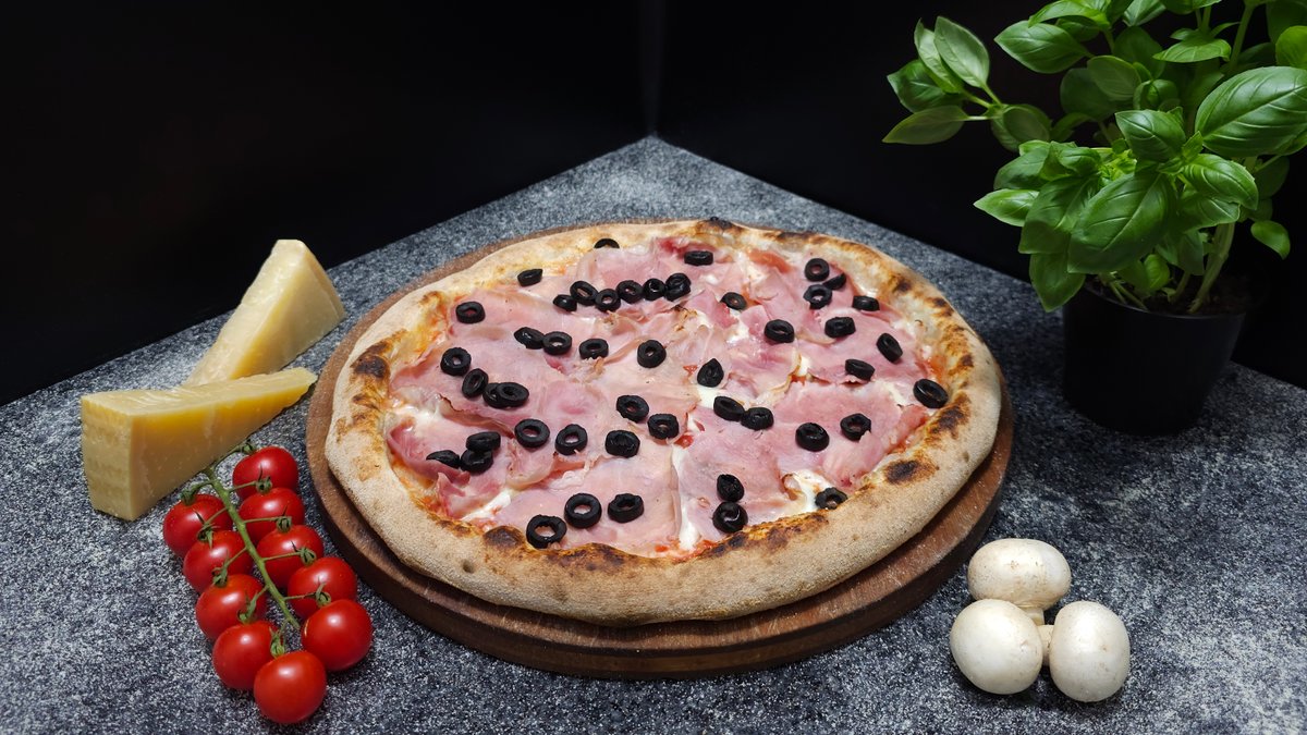 blat, sos de rosii, pecorino, fior di latte, prosciutto cotto, masline - 585g