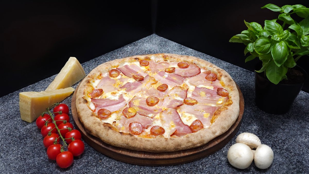 blat, sos de rosii, pecorino, fior di latte, prosciutto cotto, bacon, carnati uscati, ou batut, usturoi - 610g