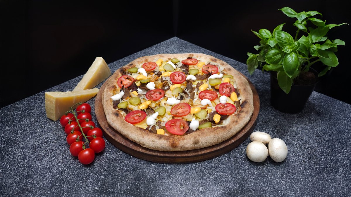 blat, sos de rosii, pecorino, fior di latte, prosciutto cotto, bacon, carnati uscati, ciuperci, ardei kapia, masline - 600g