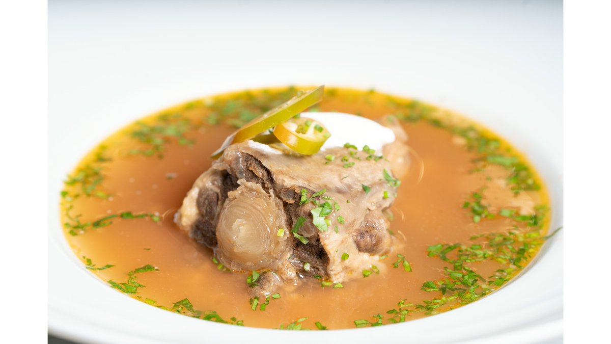 350ml. Ciorbă din coadă de vițel acrită cu borș, țelină, morcov și ceapă, aromatizată cu leuștean servită cu mujdei de usturoi și smântână