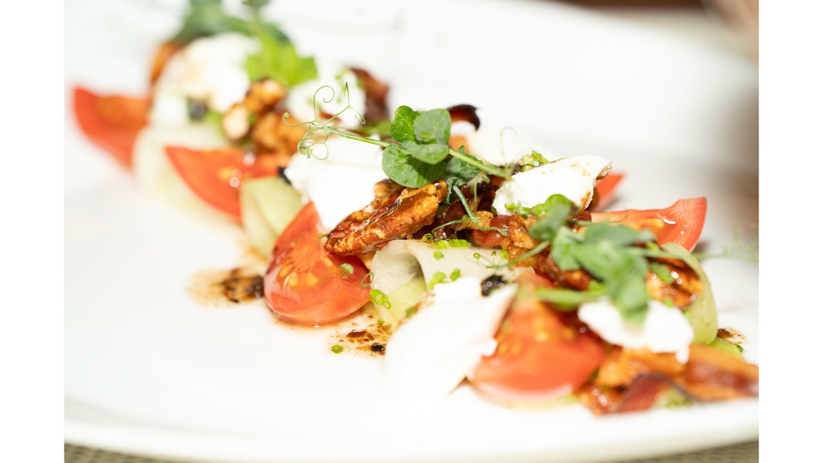 Mix de salată ,piept de rață afumat, brânza ricotta, fructe de padure, nuci pecan prajite cu dressing dulce acrișor de mure.300G