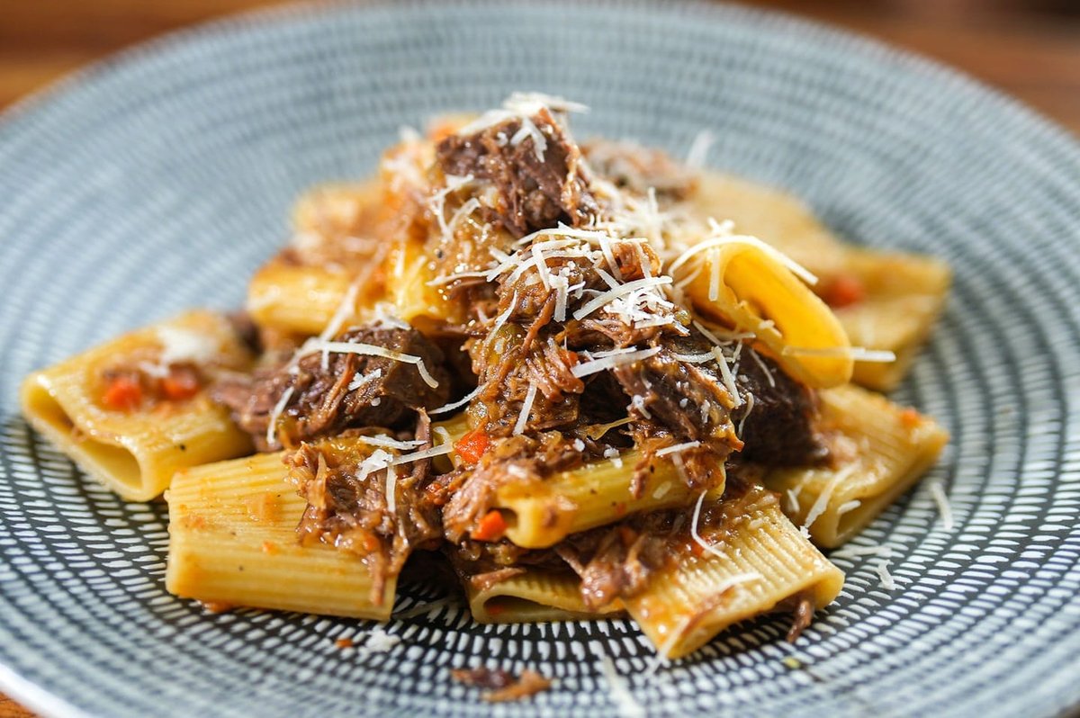 380gr. Paste Rigatoni cu ragu din carne de vită cu ceapă, usturoi, cremă de Parmezan, brânză Ricotta și busuioc proaspăt .