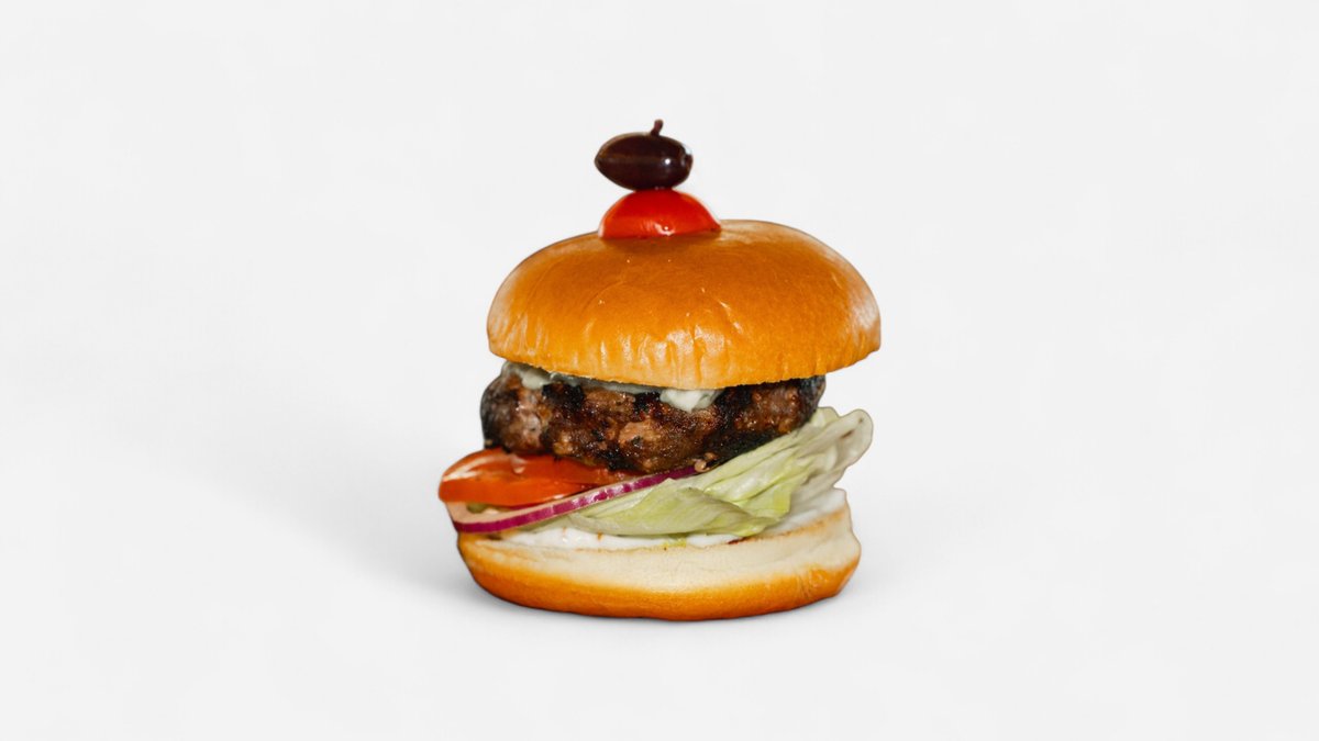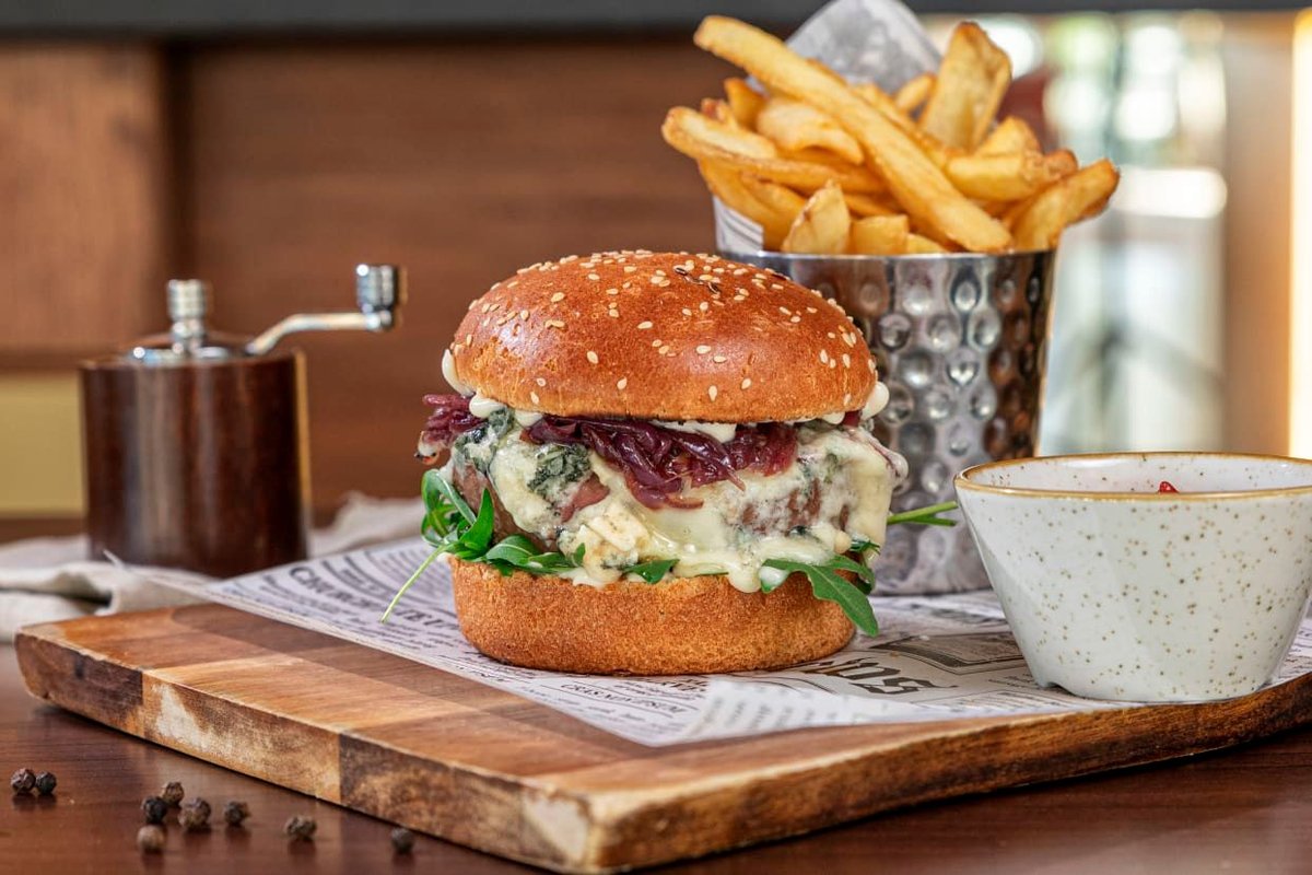 560gr. Burger de berbecuț, brioșă, maioneză cu muștar, salată Iceberg, roșii, ceapă roșie, brânză Blue Cheese, cartofi steakhouse, salată Coleslaw și sos de iaurt cu castraveți