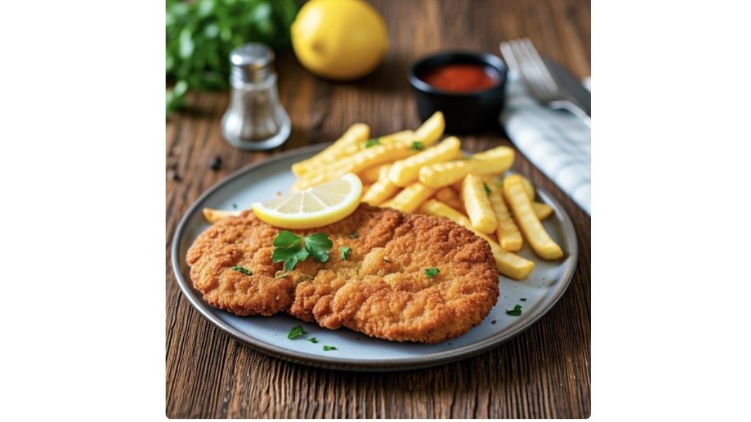 Șnițel de pui, ciuperci, smântână, șuncă praga, cartofi prăjițI Poza cu titlu informativ