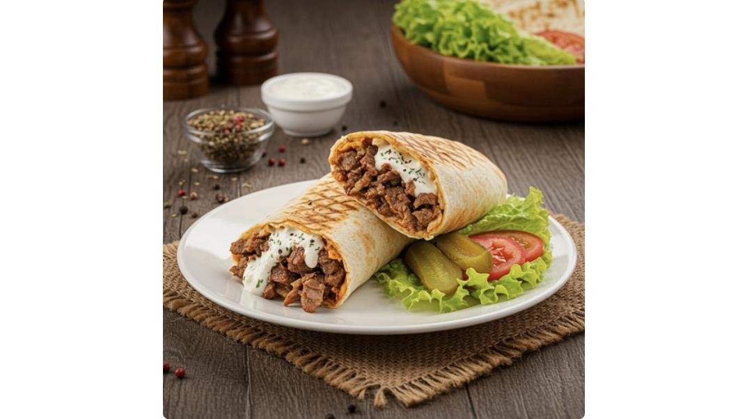 Piept de pui la grătar, condimente arabești, o porție cartofi pai, salată de varză, sos de usturoi, lipie arăbească Poza cu titlu informativ