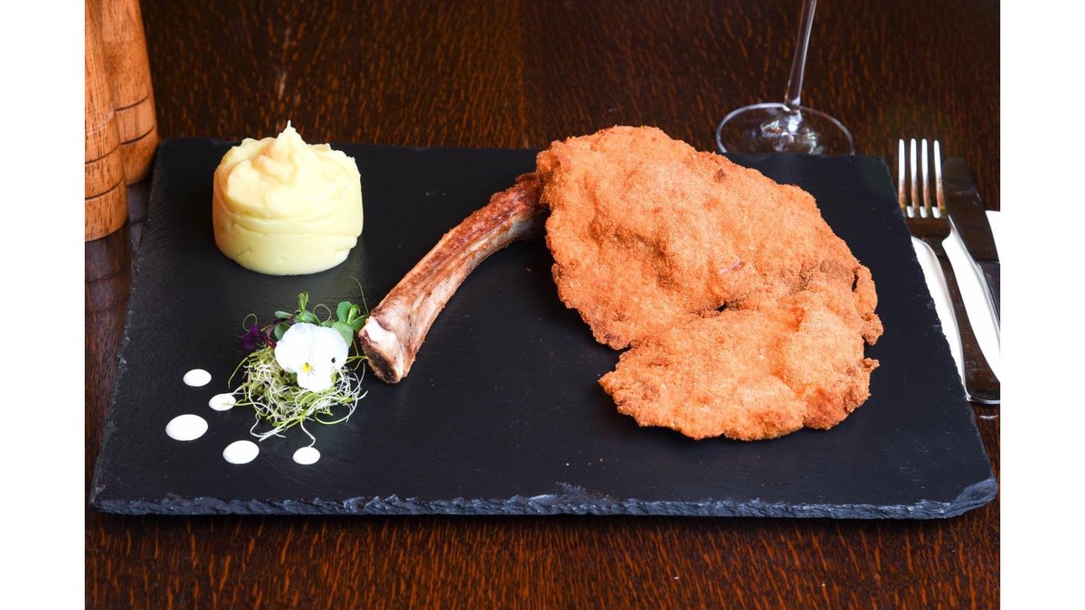 Șnițel de vițel de lapte cu os și piure de cartofi si sos de afine