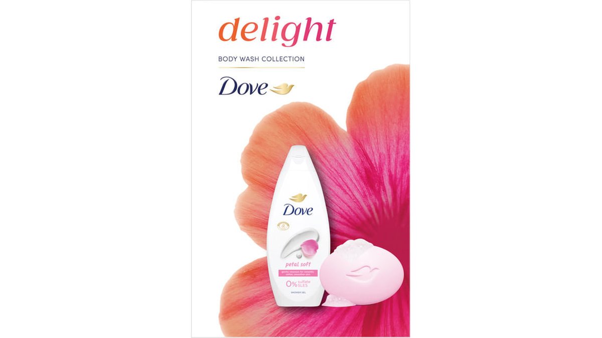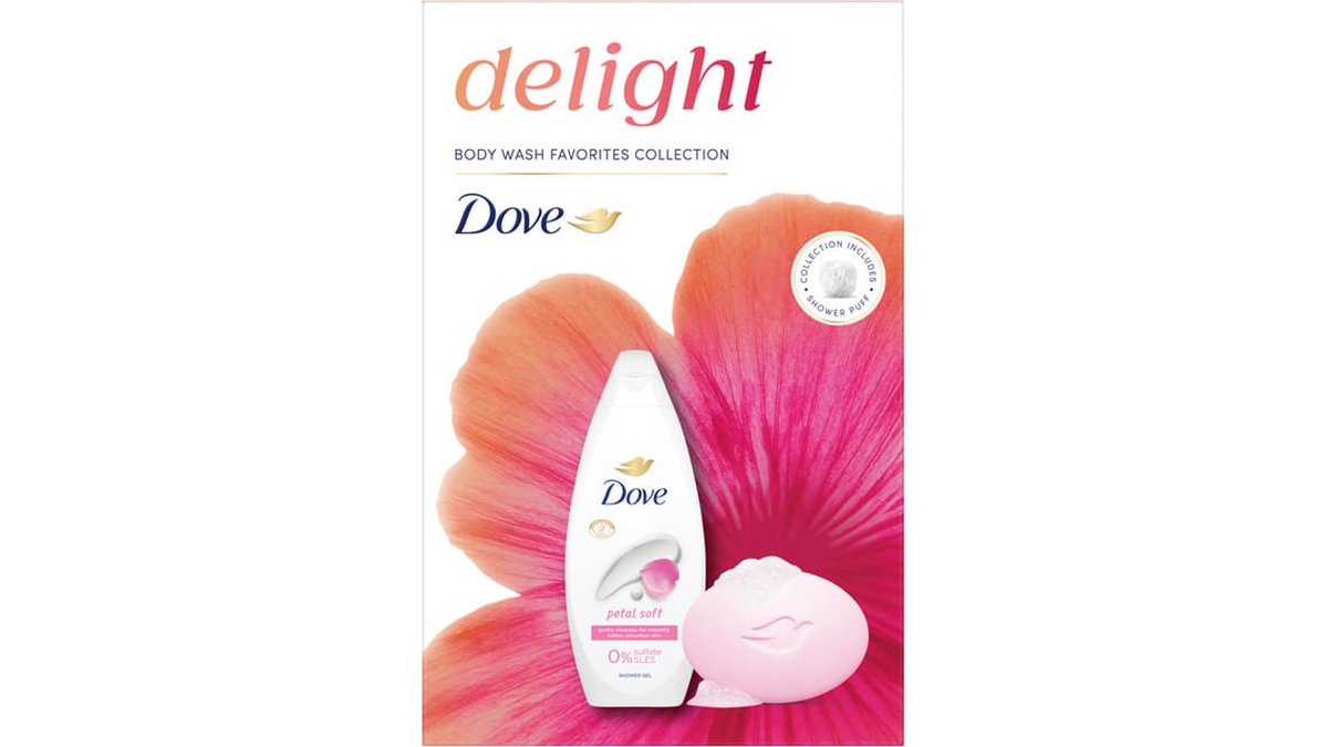 Set pentru cadou Dove Delight: gel de dus, 250 ml + sapun solid, 90 g + burete de dus