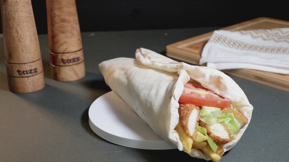 *DURUM CRISPY 430g Lipie 130g, Brichete crispy 100g, cartofi congelati 50g, sos crispy dulce/picantl 70g, salată iceberg 30g, roşii 40g, ceapă 10g CONȚINE ALERGENII: Gluten (Grâu) lactoză, ouă, boabe de muștar, semințe de susan, soia CONȚINE PRODUSE DECONGELATE: carne si cartofi congelati