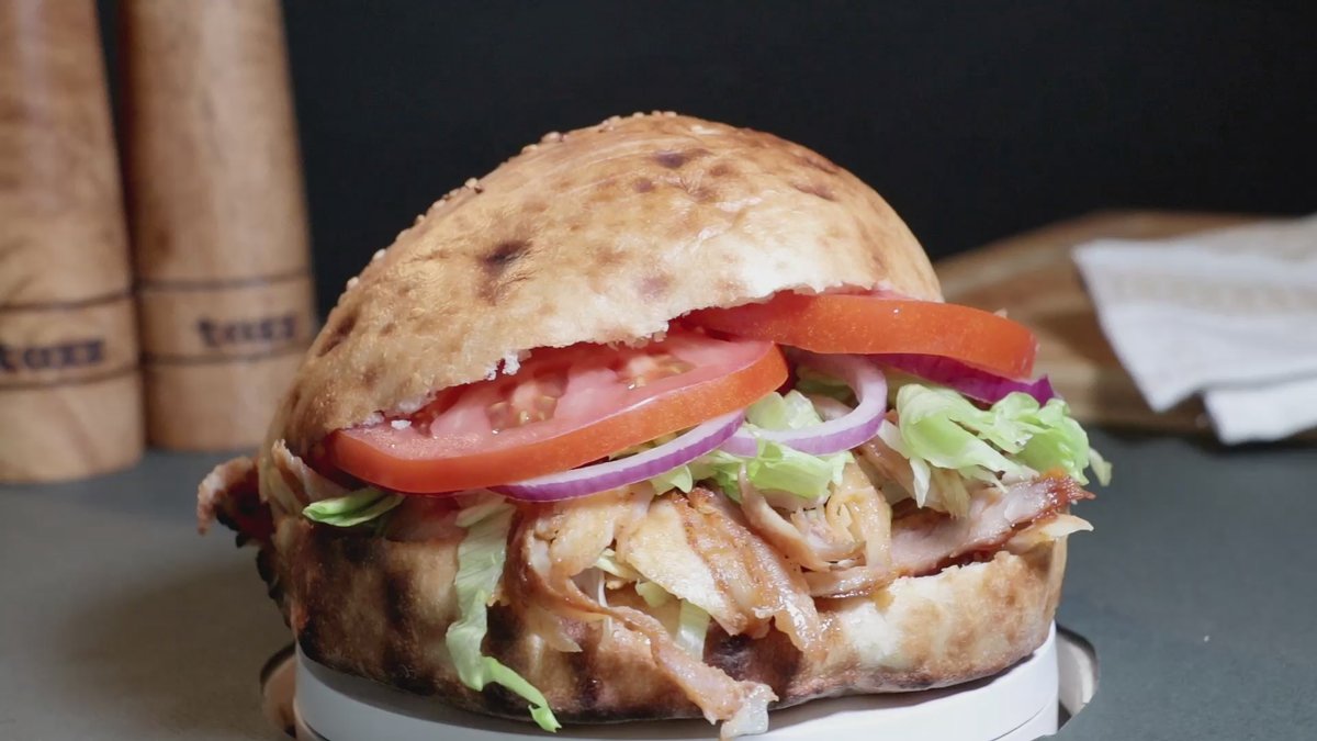 *DABO DE PUI XXL 480g Chiflă 160 g, carne kebab de pui 140g, sos special 70g, salată iceberg 40g, roşii 60g, ceapă 10g