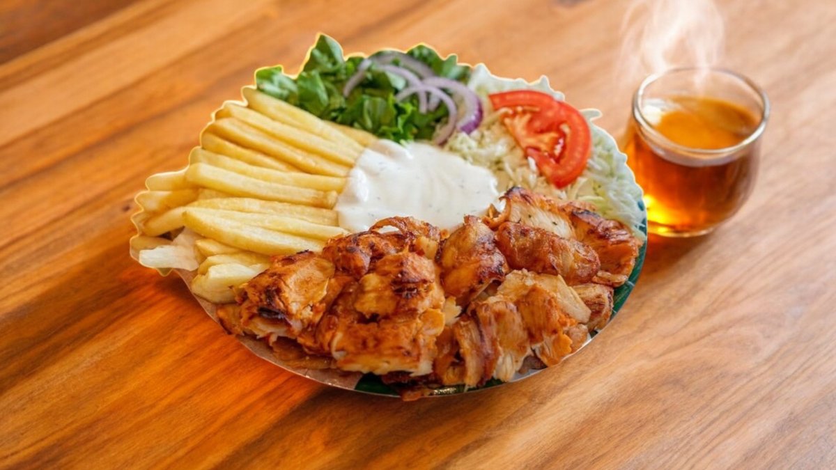 Carne de pui (carnea de pui nu este carne tocată), cartofi, varză, castraveti, ceapă, salată verde, sosuri