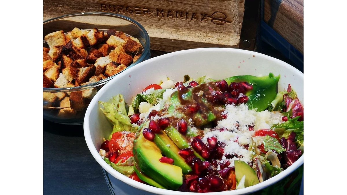 Mix de salată, roșii, castraveti, boabe rodie, dressing fresh, avocado, parmesan,seminte dovleac,fulgi de ceapa,crutoane de casă 320g