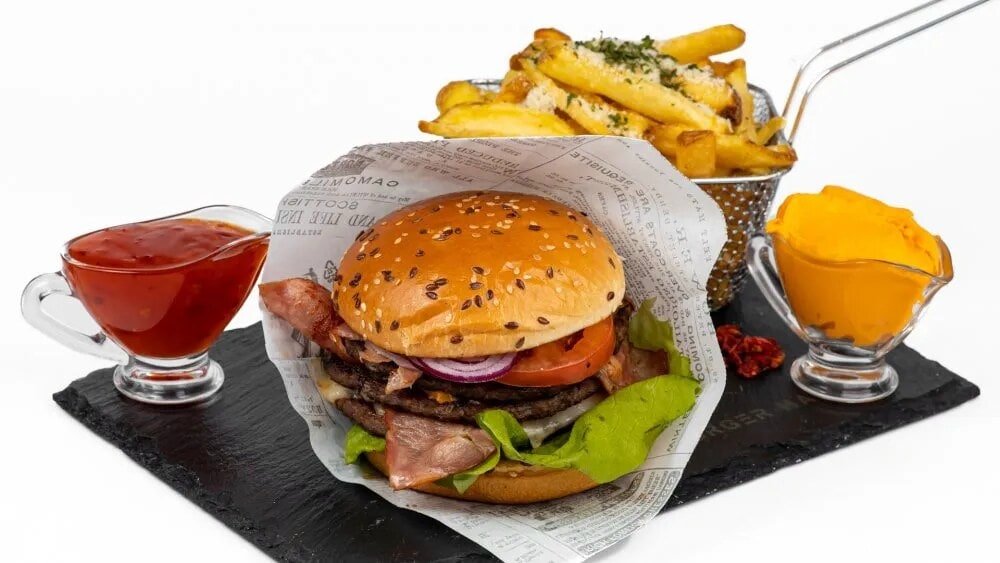 2 x carne vita,2xbacon,cheddar,gouda,dulceața ceapa,sos burger,sos maniax,salata,castraveti murati,ceapa rosie rondele,ceapa caramelizata 500g