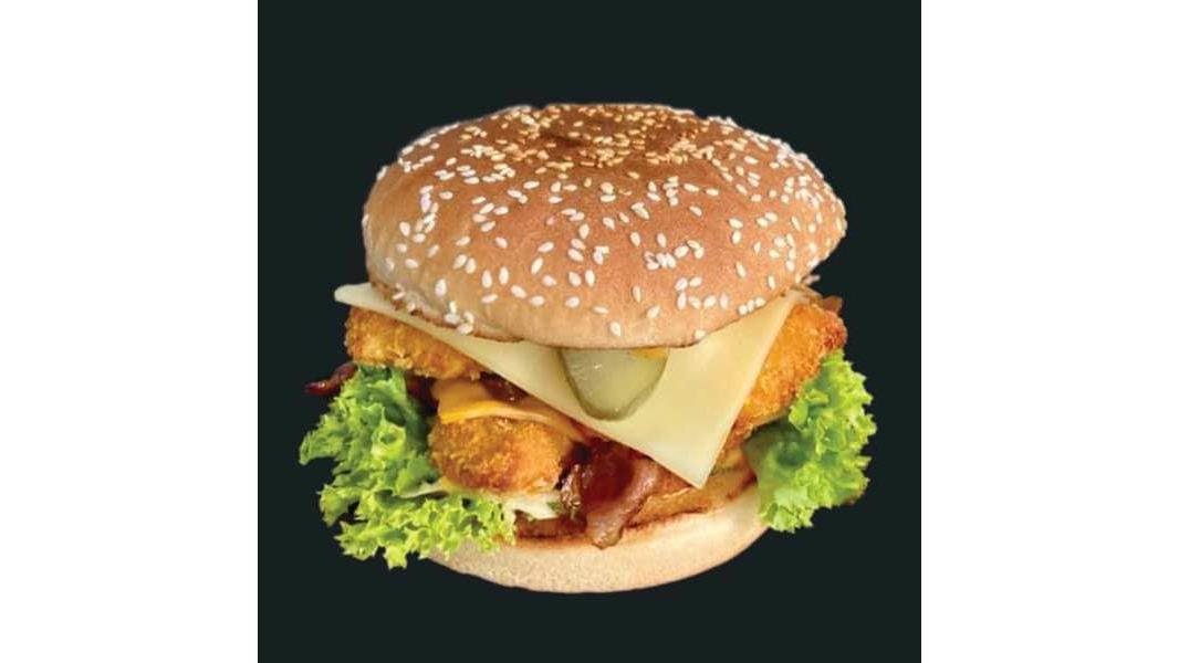 Chiflă, snitel crocant pui x 2*, ceapa caramelizata, dulceata de ceapa, ceapa rondele, salata, castraveti murati, branza Cheddar, branza gouda, sos maniax, sos burger, salata coleslaw. 450 g