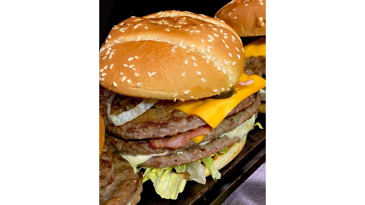 3 carne vita,2xcheddar,2 bacon,gouda,dulceața ceapa,sos burger,sos maX,salata,castraveti murati,ceapa rosie rondele,ceapa caramelizata,550g