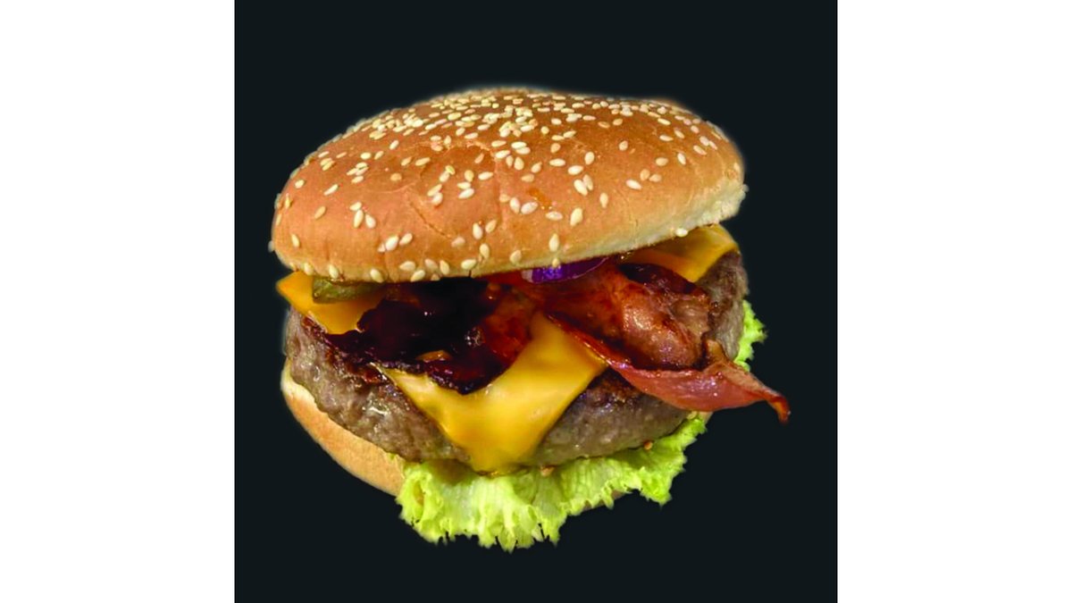 chifla burger,carne vita 200g,sosuri(ketchup46g,sos burger 50g),bacon 40g,branza cheddar x 3, ceapa caramelizata