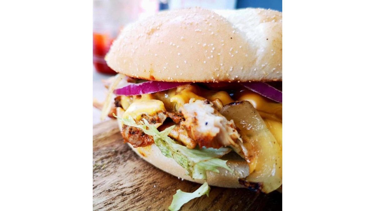 Chifla*,2xcarne pui 120g,2xcheddar 40g,ceapa caramelizata,sosuri 100g(sos burger 50g,sos ketchup 50g)