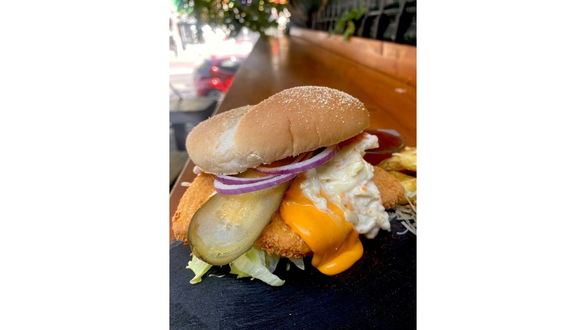 chifla,snitel pui,branza cheddar,ceapa caramelizata,salata coleslow,salata iceberg,castravete murat,ceapa rondele,sos burger,sos maniax