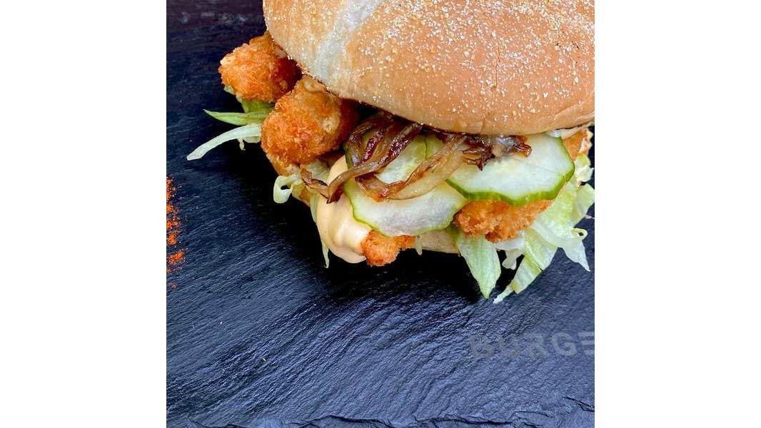chifla,creveti tempura 4 buc,sos roze,salata iceberg,castraveti praspeti,ceapa caramelizata