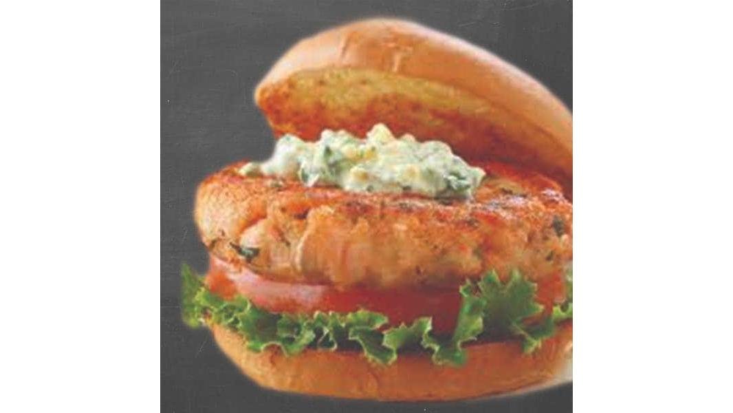 CHIFLA* 80g, carne somon* 90g sosuri 100g (ketchup 46 g,ceapa 2g,ananas 2g,sos burger 50g) ceapa caramelizata, ceapa rondele, masline kalamata, capere, salata iceberg