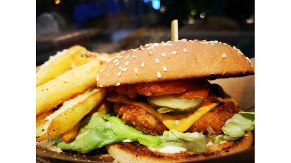 Chiflă, burger beyond, brânză de post, maioneză post, sos maniax, ceapă caramelizată, ceapă rondele, salată iceberg, castravete murat