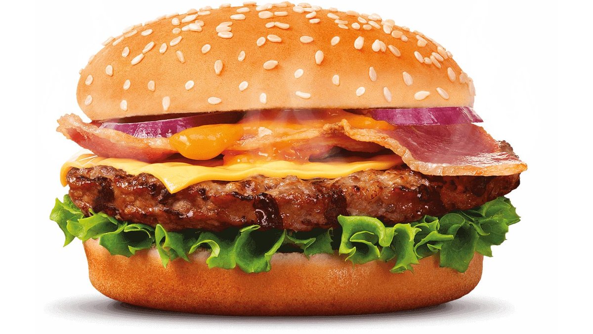 chifla* 80 g, carne vita 110g*, sosuri 100g(ketchup 46 g,ceapa 2g,ananas 2g,sos burger 50g), ceapa 20 g, bacon 20 gcastravete murat 14 g, branza cheddar 12 g, salata iceberg