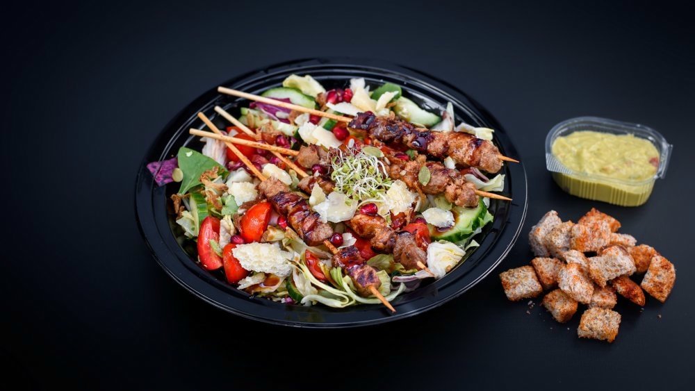 Carne curcan frigarui, condimentat mediterranean 100g, semințe dovleac, mix de salata, rosii, castraveti, boabe rodie, dressing de rodie, parmesan, crutoane de casa 320g