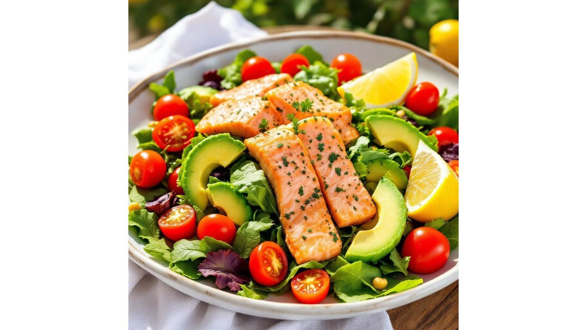 Somon grill 100g, mix de salata, rosii, castraveti, boabe rodie, dressing de rodie, parmesan, crutoane de casa, seminte dovleac, fulgi de ceapa, fulgi de parmesan 320g