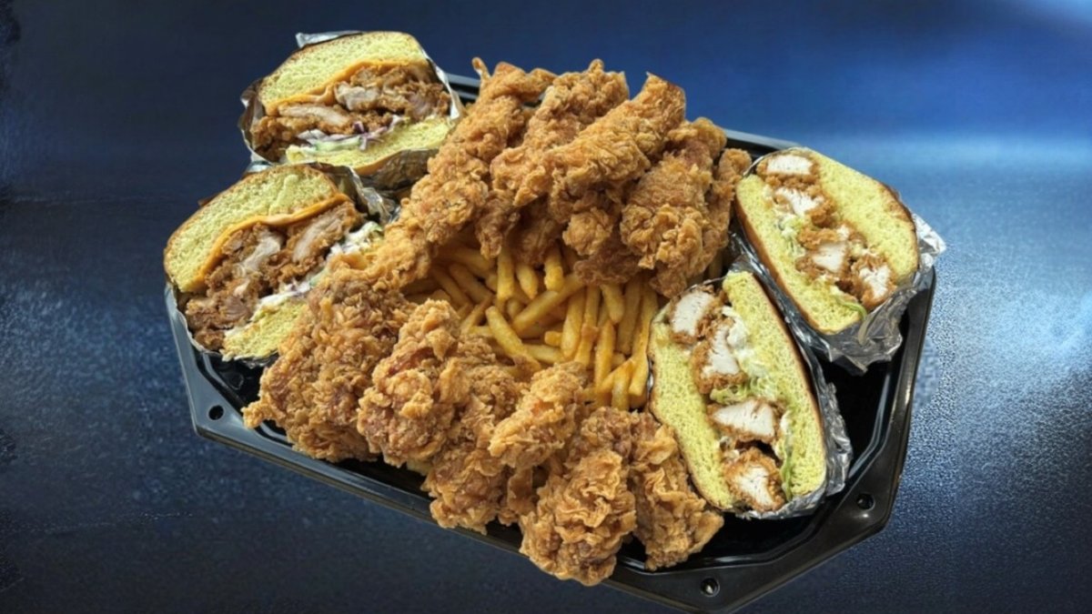 8 chicken fingers , 8 aripi pane , sandwich deluxe , sandwich crispy , cartofi prăjiți , 4 salate coleslaw , 4 sosuri (usturoi, BBQ, Cheddar, chilly), 4 felii de paine . 1800g