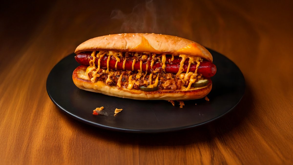 Bagheta, carnat vita porc eticheta curata, chilli con carne, cheddar, sos animal style, ceapa caramelizata, castraveti murati, fulgi de ceapa, spicy mayo, jalapeno.