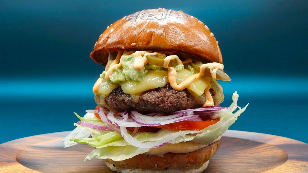 Pain brioche, antricot de vită, jalapenos, salată, felie de roșie, ceapă, guacamole, brânză cheddar, sos spicy mayo.( 340 g)