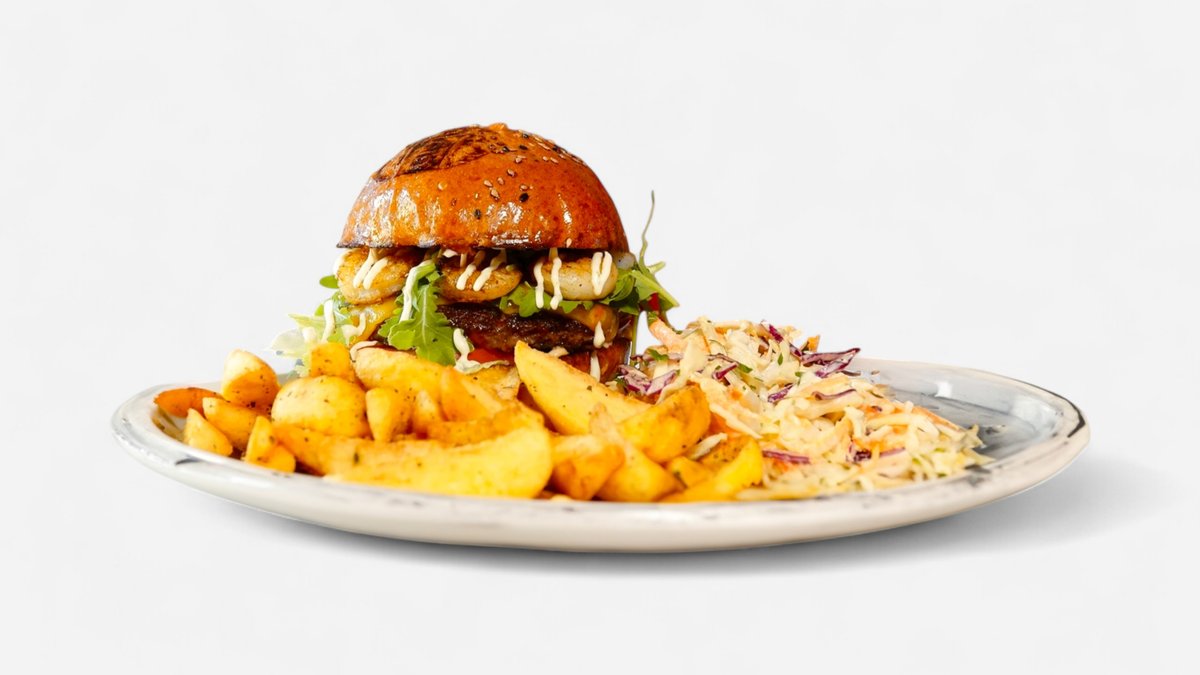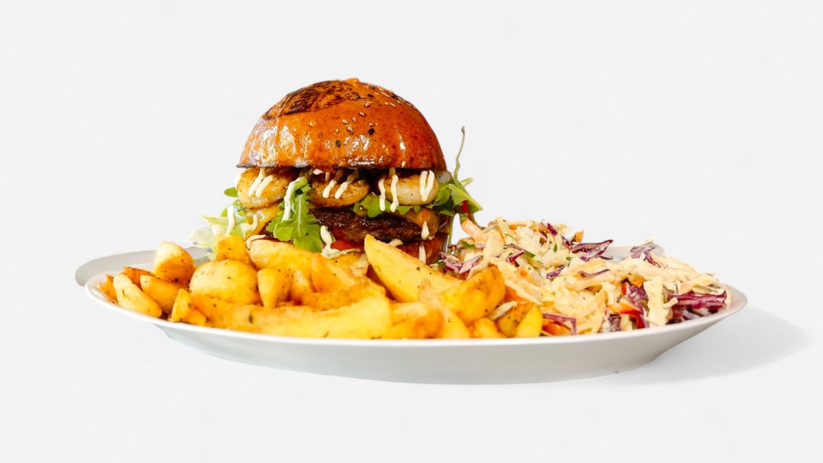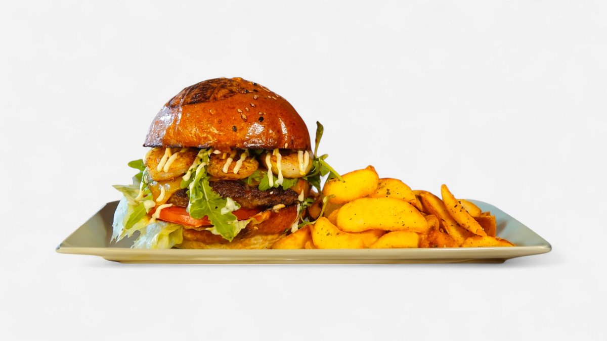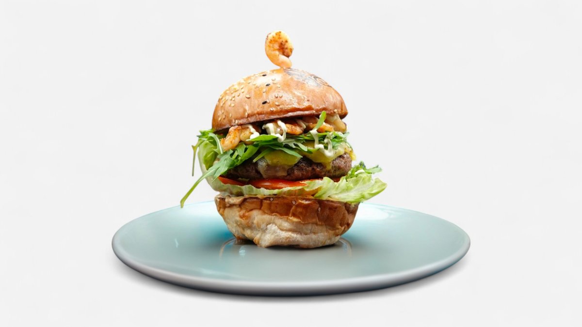 Pain brioche, antricot de vita, creveti, cheddar, salata iceberg, rosii, rucola, sos Big5, surf sauce.