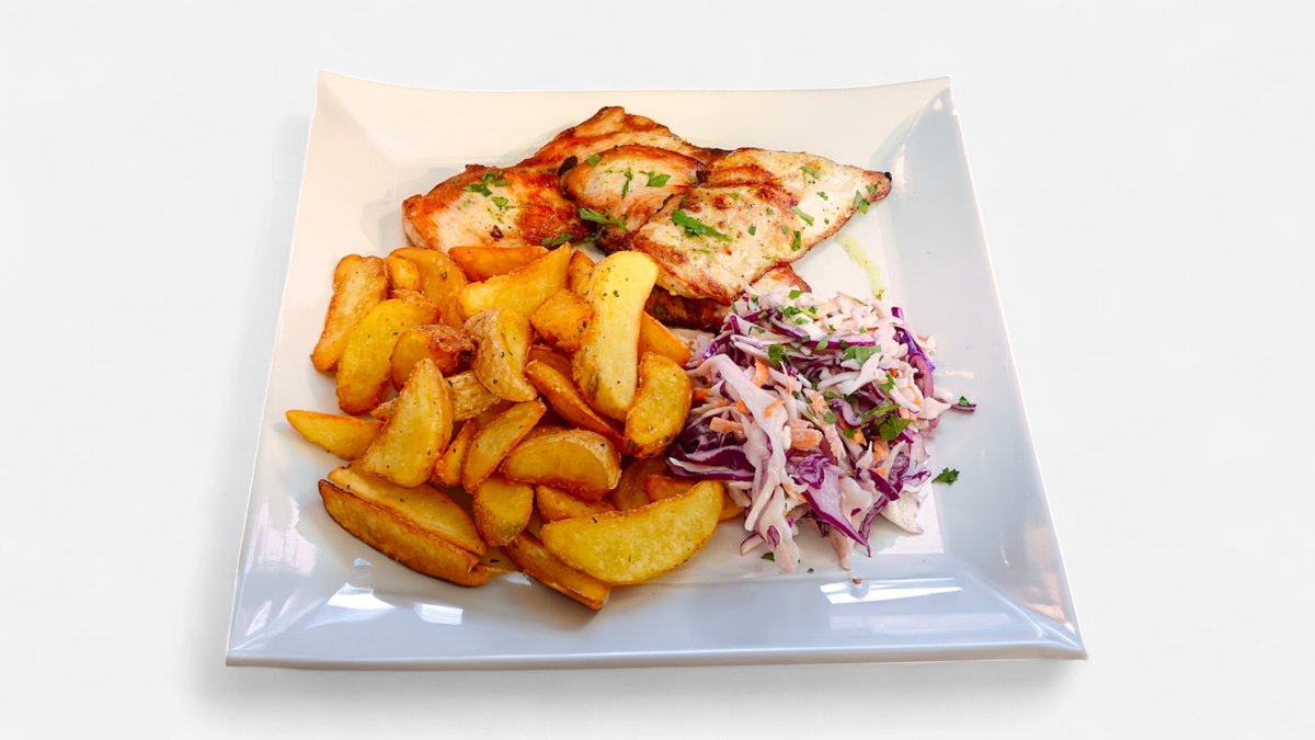 Piept de pui marinat in ierburi, cartofi, salata coleslaw 150g/150g/100g