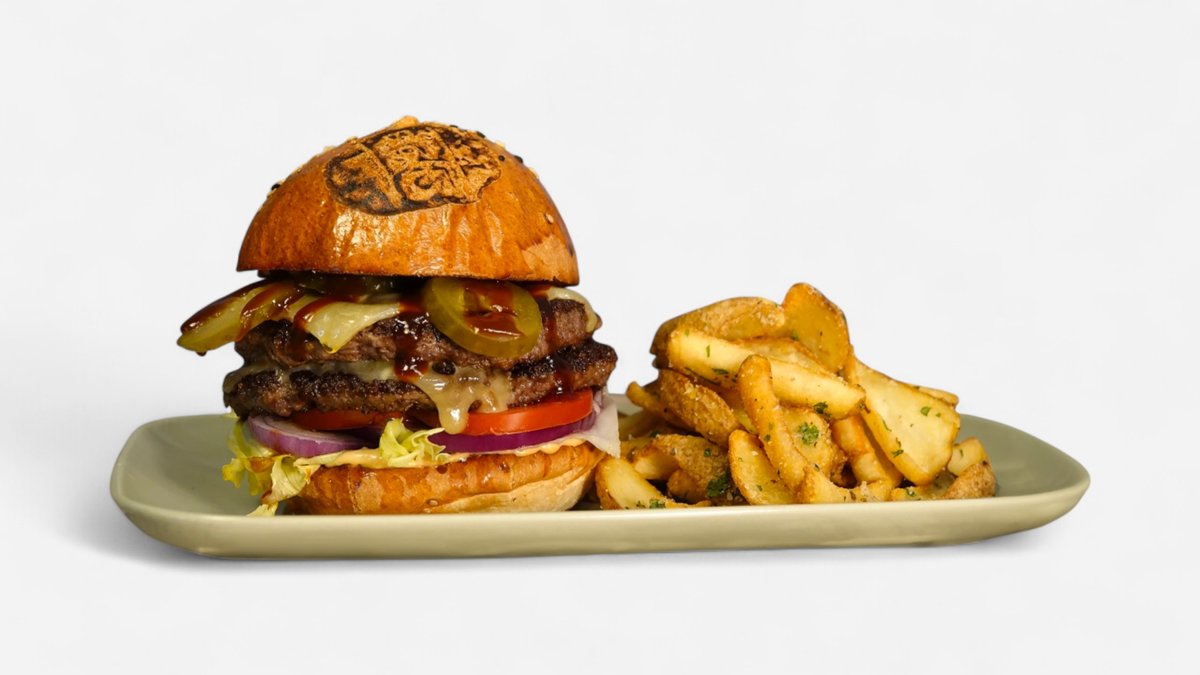 Burger Double Double (Pain brioche, antricot de vita x2, cheddar x2, salata, rosii, ceapa, castraveti murati, sos BBQ, sos big5 - 480g) Cartofi Sos la alegere.