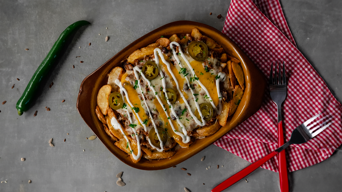 Cartofi, chilli con carne, mix branzeturi, jalapenos, smantana - 400g