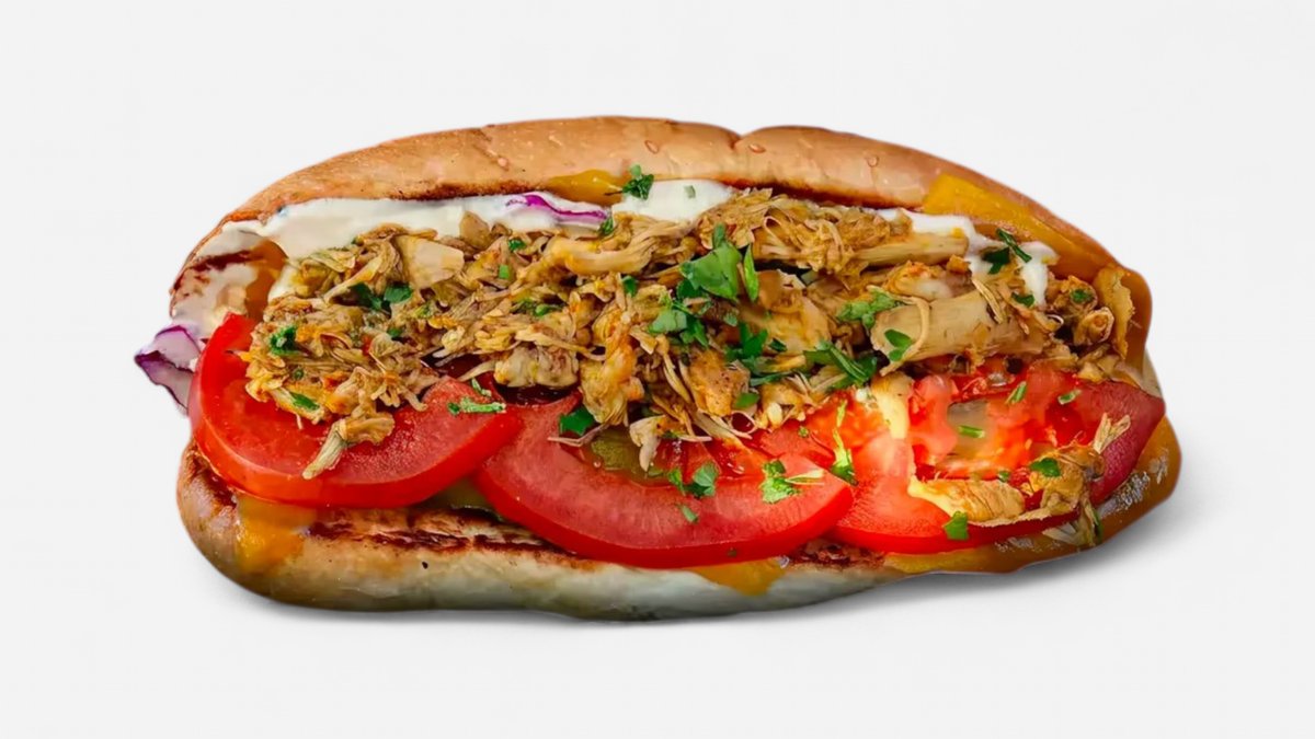 Baghetă, pui gătit încet, cheddar, coleslaw, roșii, castraveți murați, sos de usturoi