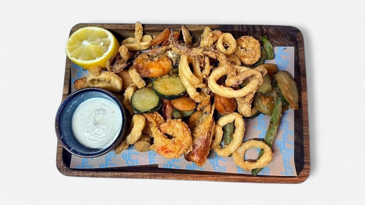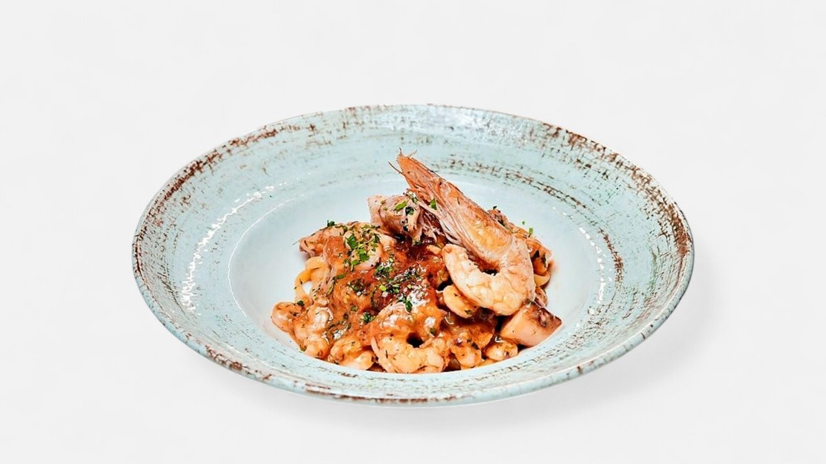 Paste gigli (160g), sos de roșii San Marzano*(30g), creveți întregi(30g), cozi creveți(40g), gamberetti boreali(20g), caracatiță(25g), roșii cherry(20g), usturoi(5g), pătrunjel, peperoncino, ulei de măsline(5ml) 430g