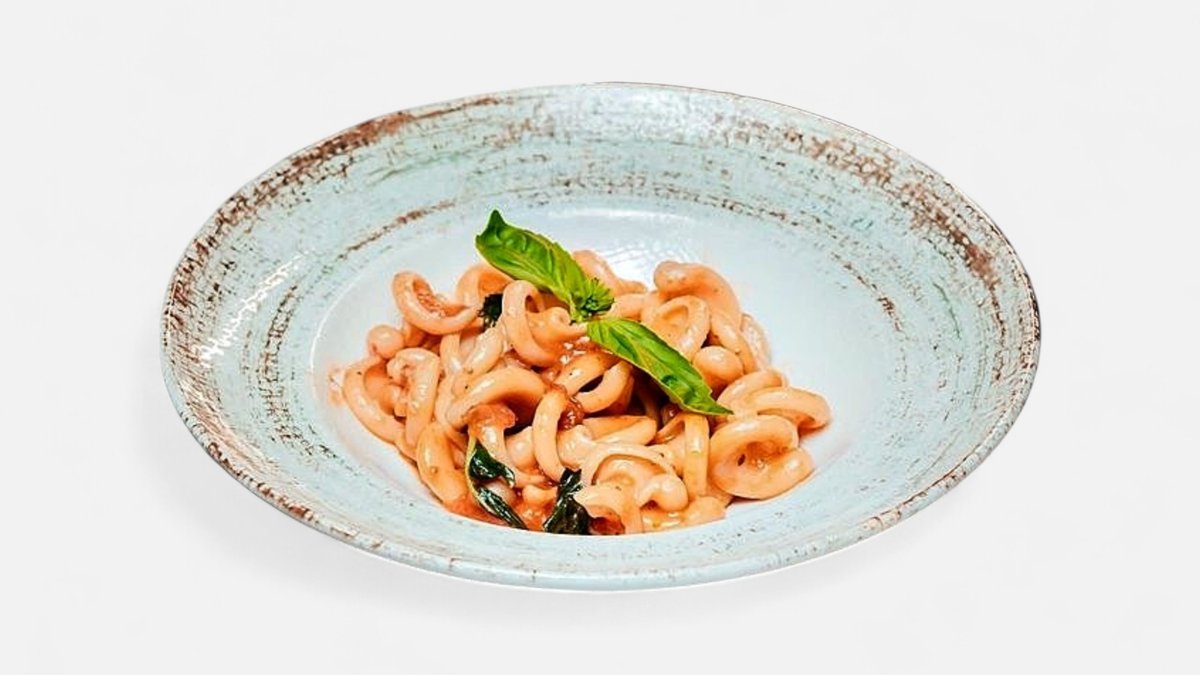 Pastă scurtă(160g), sos de roșii San Marzano*(80g), busuioc, ulei de măsline, Parmigiano Reggiano*(Maturat +35luni)(30g) 280g