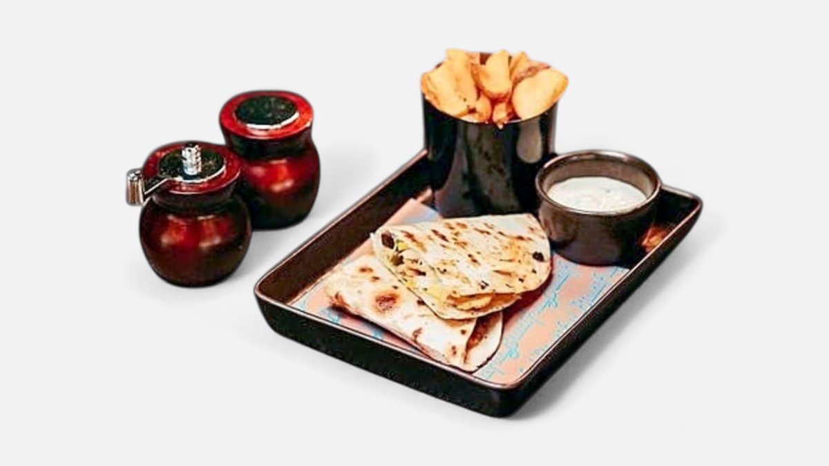 Quesadilla cu piept de pui(80g), cheddar(30g), ardei jalapenos(10g), porumb, pătrunjel, ciuperci, însoțită de cartofi dippers(170g) și sos de iaurt cu ceapă verde(50g) 370g