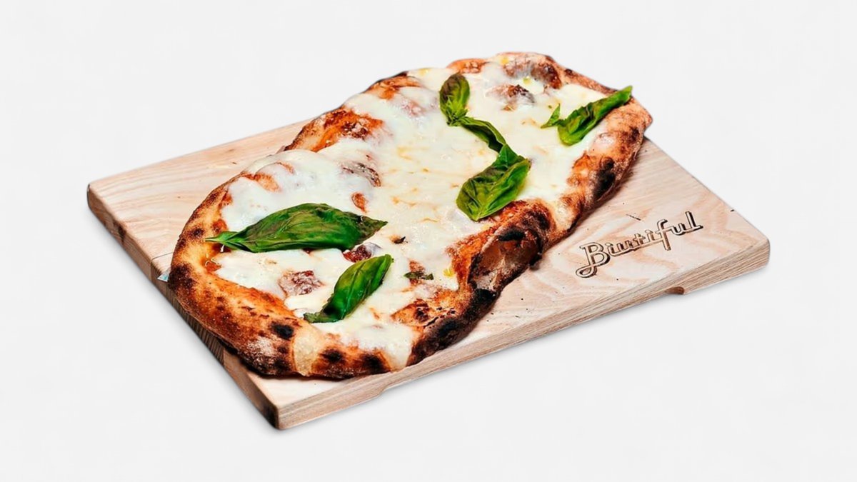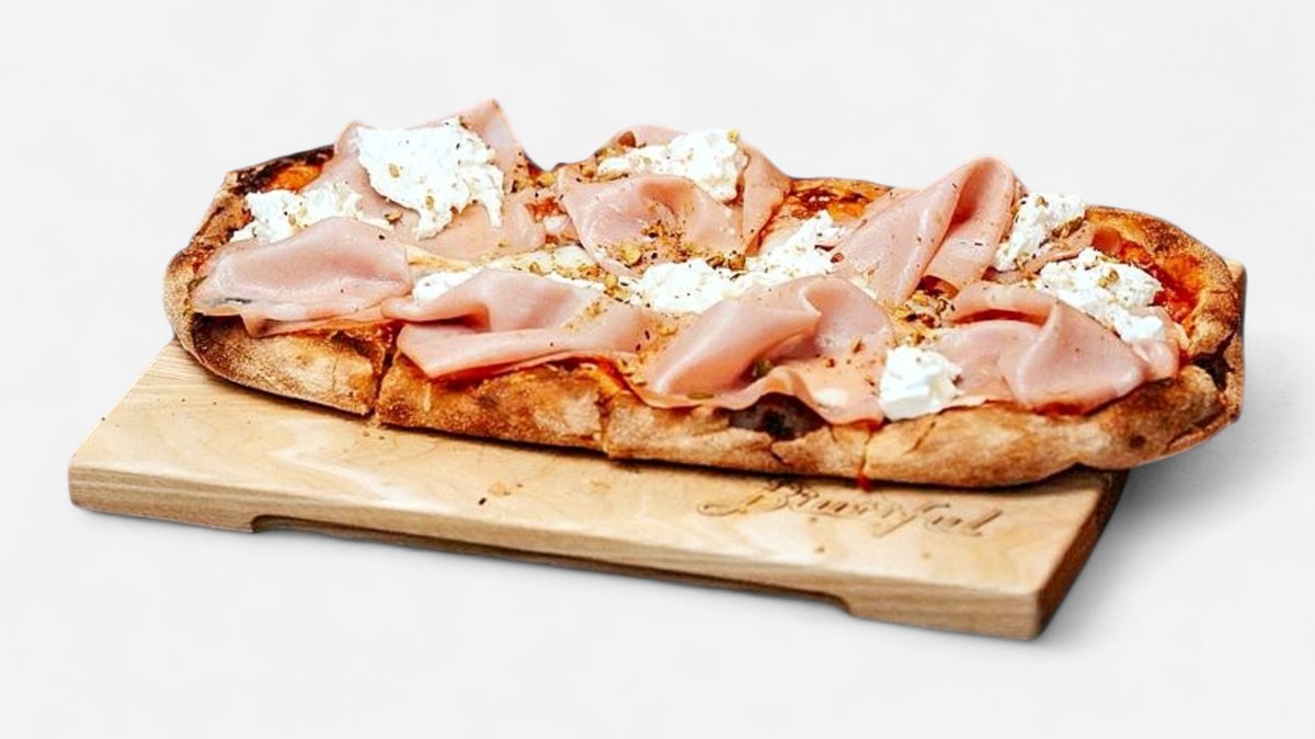 Blat pinsa(220g), sos de roșii San Marzano*(100g), mozarella fior di latte(100g), mortadella(125g), buratta(125g), Parmigiano Reggiano*(Maturat +35luni)(50g) 650g