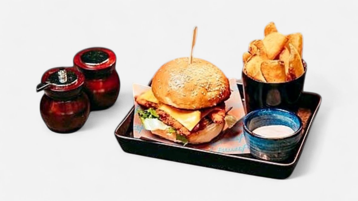 Șnițel din piept de pui(150g), branza cheddar(20g), sos de maioneză cu ketchup și muștar, salată, chiflă burger(80g), cartofi dippers(170g), sos cocktail(50g) 490g