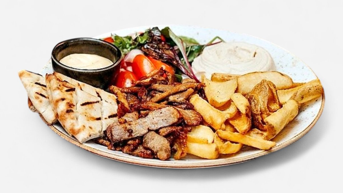 Fâșii din piept de curcan si pui (130g) cu cartofi dippers, mix de salată cu roșii (50g), maioneză de casă (50g), hummus (100g). pită grecească (54g) 500g
