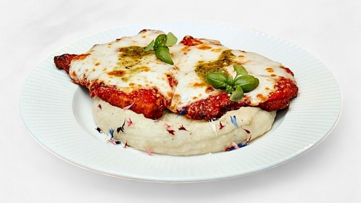 Șnițel crocant din piept de curcan(220g), servit cu piure de cartofi și pesto (160g), mozzarella (40g), parmezan (20g), sos de roșii (30g) 450g